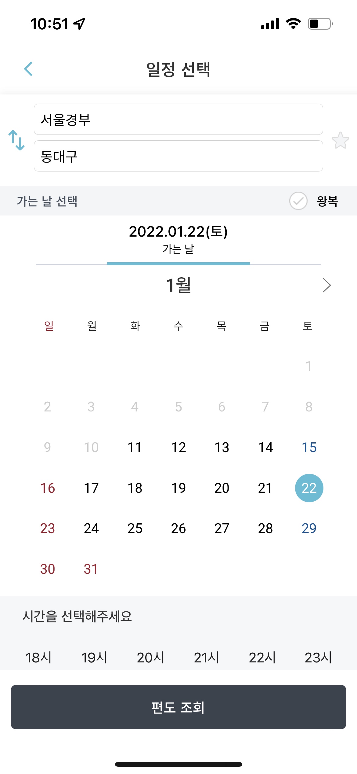 ("도착지" 정보가 뜨지 않는 경우, "출발지"에서 "도착지"로 운행하지 않거나 현장발권만 가능한 경우입니다.)